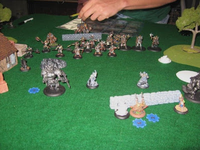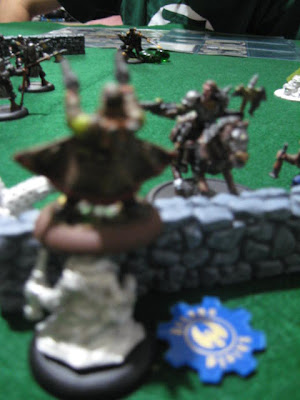 This picture was taken simply because I thought it was funny. Caine had been posted up behind a rock wall, shooting whatever came close enough. Stannis rode up, took a swing, and missed. Luckily Caine filled him full of lead. Next turn however, Caine had to figure out how to deal with the remaining Steelhead Cav. This required the use of Magic Bullet, and climbing up on the wall. (We decided it was okay to do that at the time.) To prop Caine up, I used Reinholdt, so it made it look like Caine was standing on the Gobber's head to get the shots off.