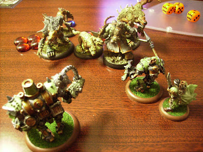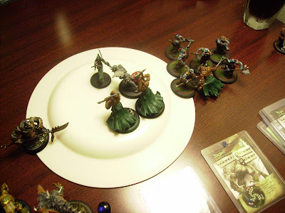Megan and I went to the Pittsburgh, PA area for a short mini-vacation. While we were there we played a short game of WARMACHINE. She took Magnus and I used Kaya. We didn't have any terrain to use so we improvised with plates and other stuff from around the room. The game was rough and tumble. Boomhowler faced off against the Thran Ravangers but not before the Totem Hunter killed Eyriss.