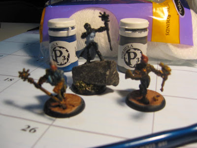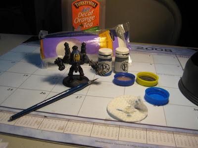 With a jug of Decaf Orange Tea, Iced Tea caps, a package of cotton rounds, P3 paints, and a bunch of paint brushes ... I again attack the Thunderhead. Slowly but surely, the big guy is coming along.