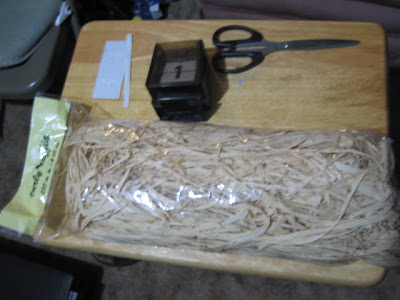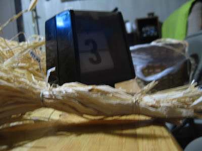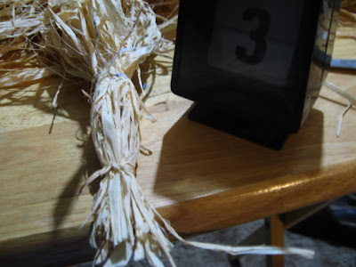 (1) When making wheat stooks you'll need the following materials. (We bought them at Michaels in Greensburg, PA when we went to check out The Vault.) A large bag of decorative raffia, a bag of wooden craft circles the size of medium bases, super glue, white glue, flock, scissors, and a few twist ties. (Use PP medium bases if you wish. It was more cost effective for me to use the wooden circles.)