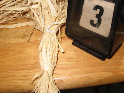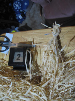 (4) Then take a small length of scrap raffia and tie it around the middle of the stook to bind it into place. This can be tricky if you have clumbsy fingers like me.