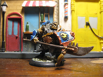 I finally finished up my Merc Bokur that I field with my Cygnar army. I gave him a shield from a Lancer, and painted his armor plating with blue colors. (Cygnar Blue Base, Cygnar Blue Highlight, and I-Kore Coraline Blue.) He's all fired up for TempleCon and looking to team up with his buddy Maxwell Finn.