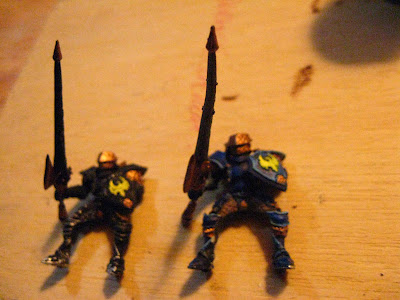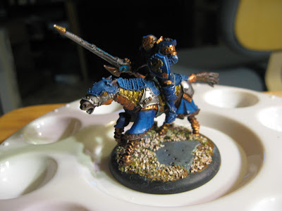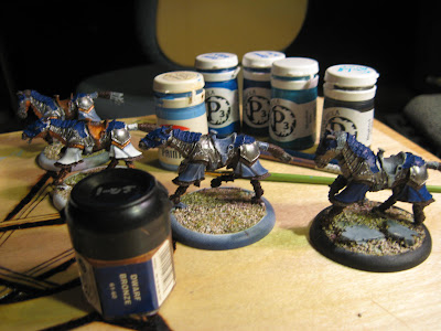 If nothing else, I will have my Stormlances painted for TempleCon! I waited forever to get these guys. They were on order from Privateer Press for like 3 months before I got them. I am painting them with a "different" paint scheme, using blue, gold, silver, and bronze. For the bases, I am going for an urban ruins look much like some of the artwork in Legends. I am using some sculpted plastic bases, and Slate Rock for the rubble.